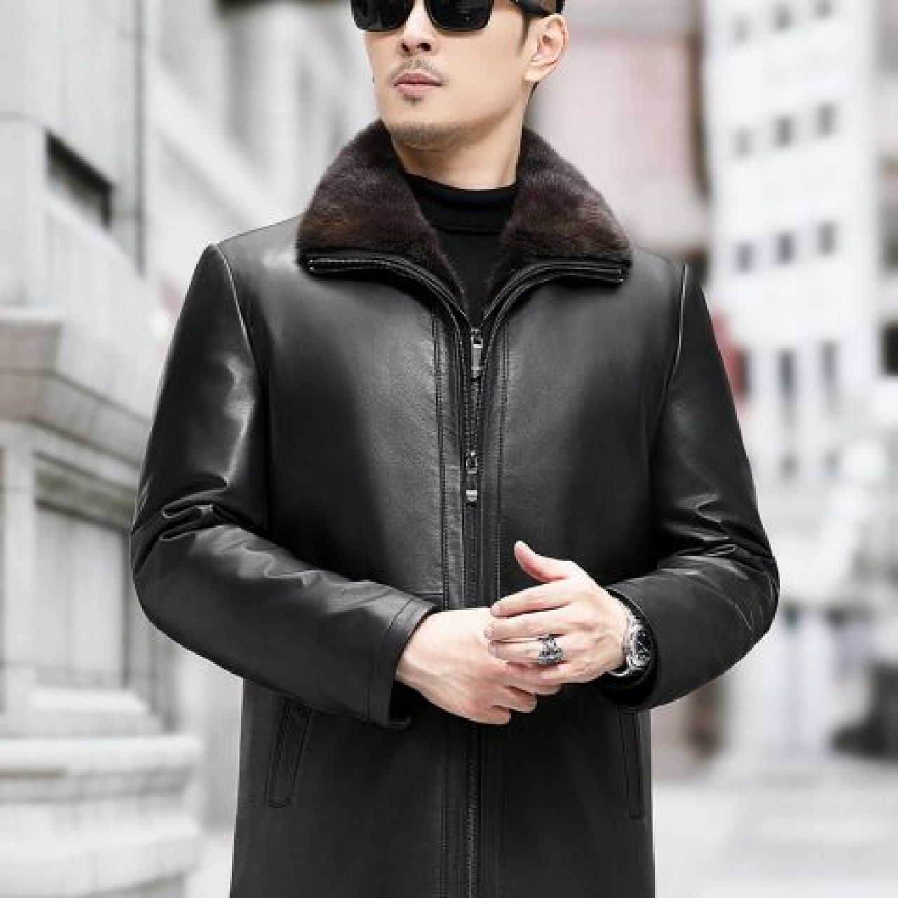 • 牛皮加厚翻领中长款羊毛内胆男士皮夹克
